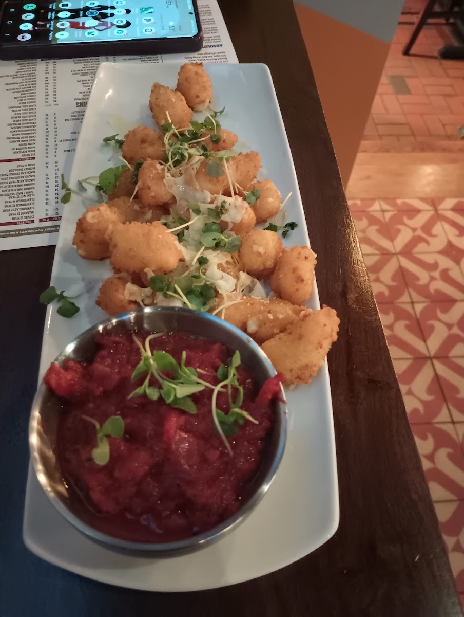 the food was absolutely delicious, atmosphere was upbeat. service was fantastic our waitress knew the menu and had fabulous recommendations. the French dip, pesto flatbread (sooo good real pesto), the ring of fire (sweet n spicy), and boom boom chicken skewers were all fantastic! miss kiahna was the best waitress very upbeat/bubbly and very knowledgeable!